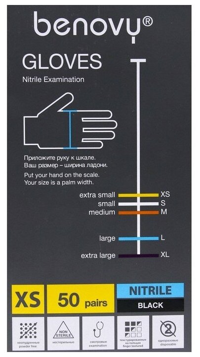 10 цен на Перчатки медицинские "BENOVY", нитрил, нестерильные, черные, размер XS, 50 пар