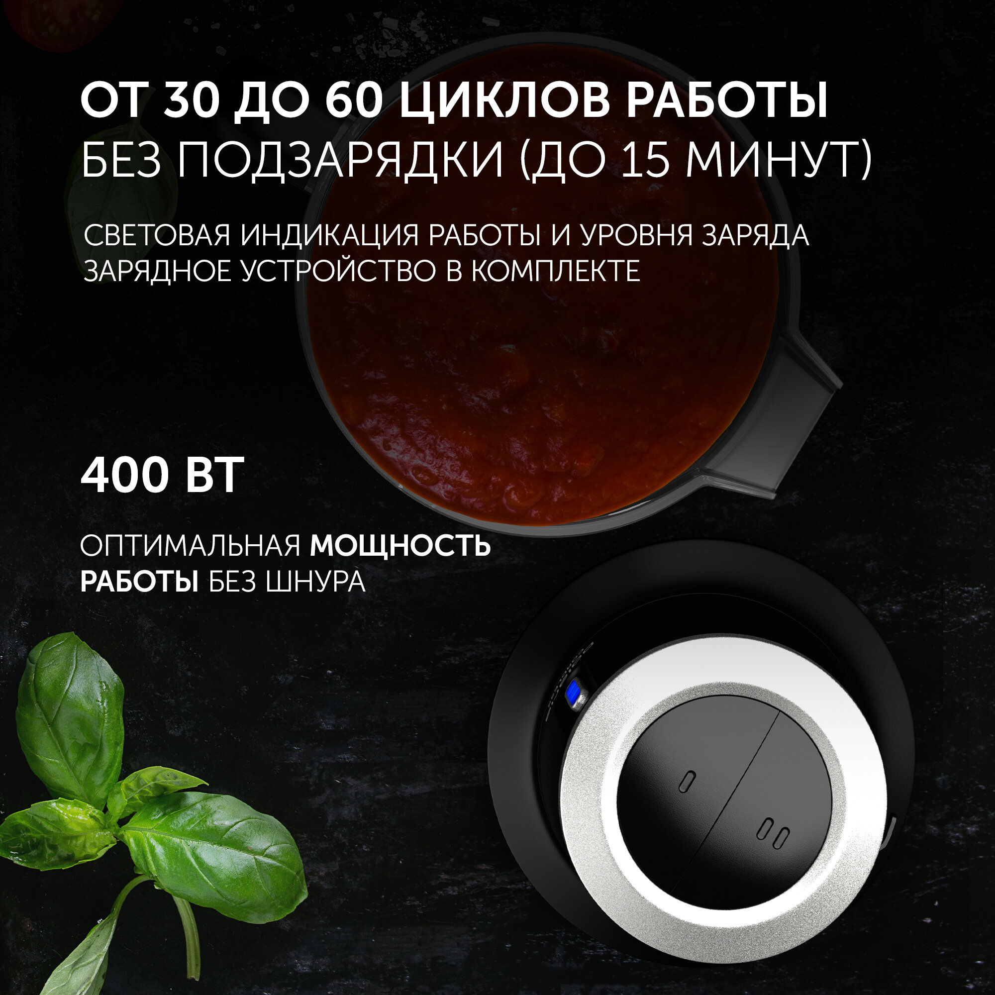 | Дополнительная информация | до 15 минут автономной работы; от 30 до 60 циклов работы без подзарядки; время зарядки аккумулятора 5 часов; кувшин BPA Free объемом 1,5 литра; двухсторонняя шкала уровня наполнения; световая индикация работы и уровня зарядки; аккумулятор: Li-ion 2000 мАч, 11,1 В |