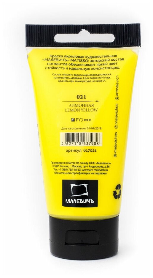 Малевичъ Акриловая краска Малевичъ Matisso, лимонная, 60 мл информация:
