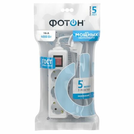 Удлинитель сетевой для розетки фотон 16А 5 метров 3 розетки с выключателем с заземлением белый, ГОСТ 742 ₽