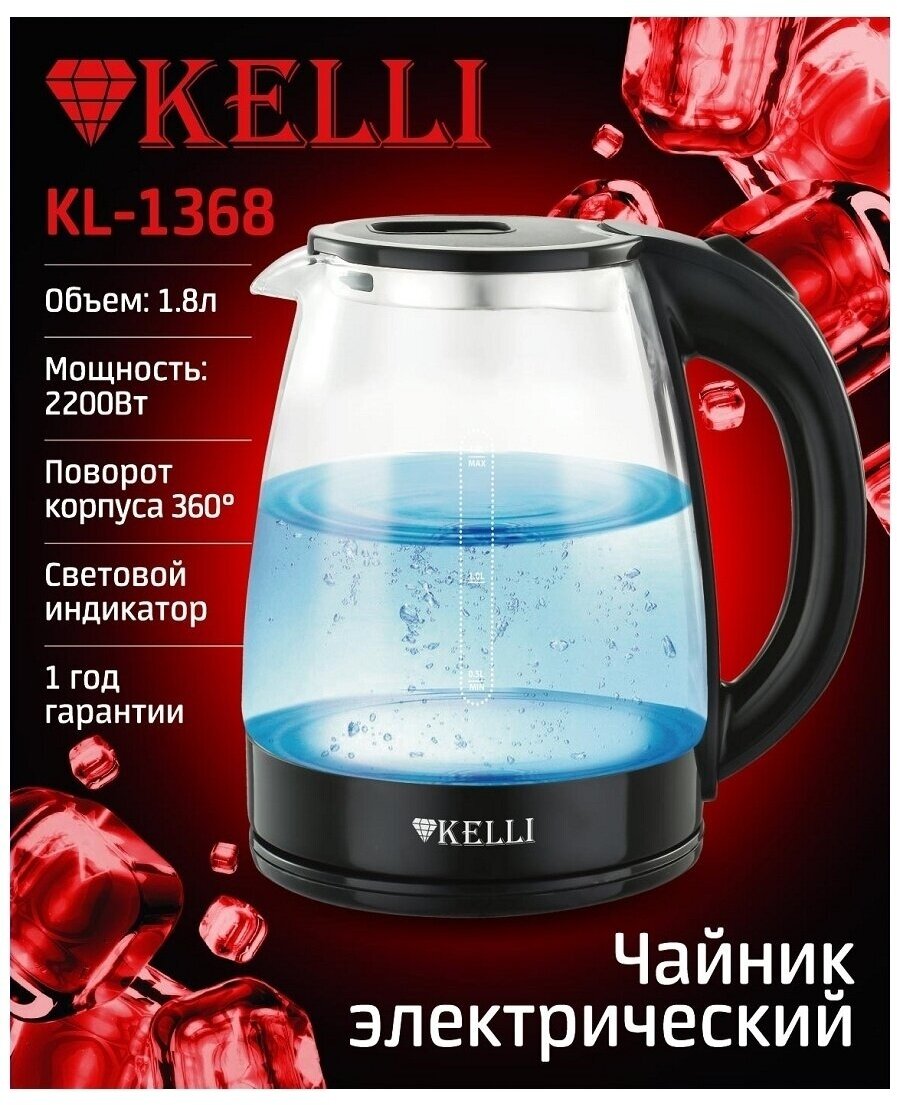 Чайник электрический KELLI KL-1368 1,8 л, 2200 Вт, стекло/черный