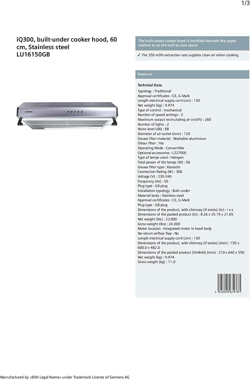 Встраиваемая в шкаф вытяжка SIEMENS LU16150GB iQ300 информация: