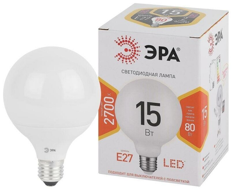 Отзывы на Лампа светодиодная LED G90-15W-2700K-E27 G120 15Вт шар E27 тепл. бел. декор. ЭРА Б0049077
