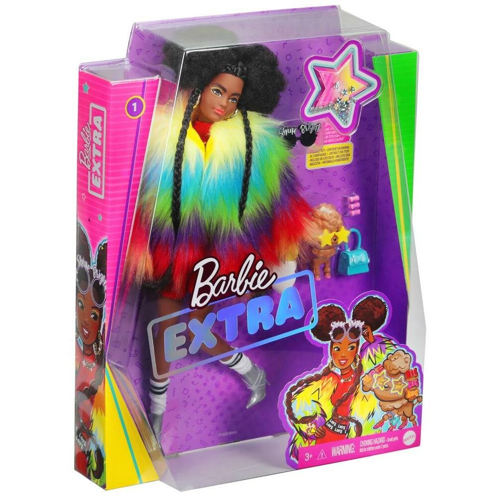 | Дополнительная информация | Барби Extra следует принципу «чем больше модных деталей, тем лучше». Кукла представлена в красно-черной спортивной одежде, сочетающейся с ярким радужным меховым пальто. Цвета и дизайн могут отличаться от изображений. Кукла не может стоять без опоры. Габариты упаковки 32см x 25см x 6см. |