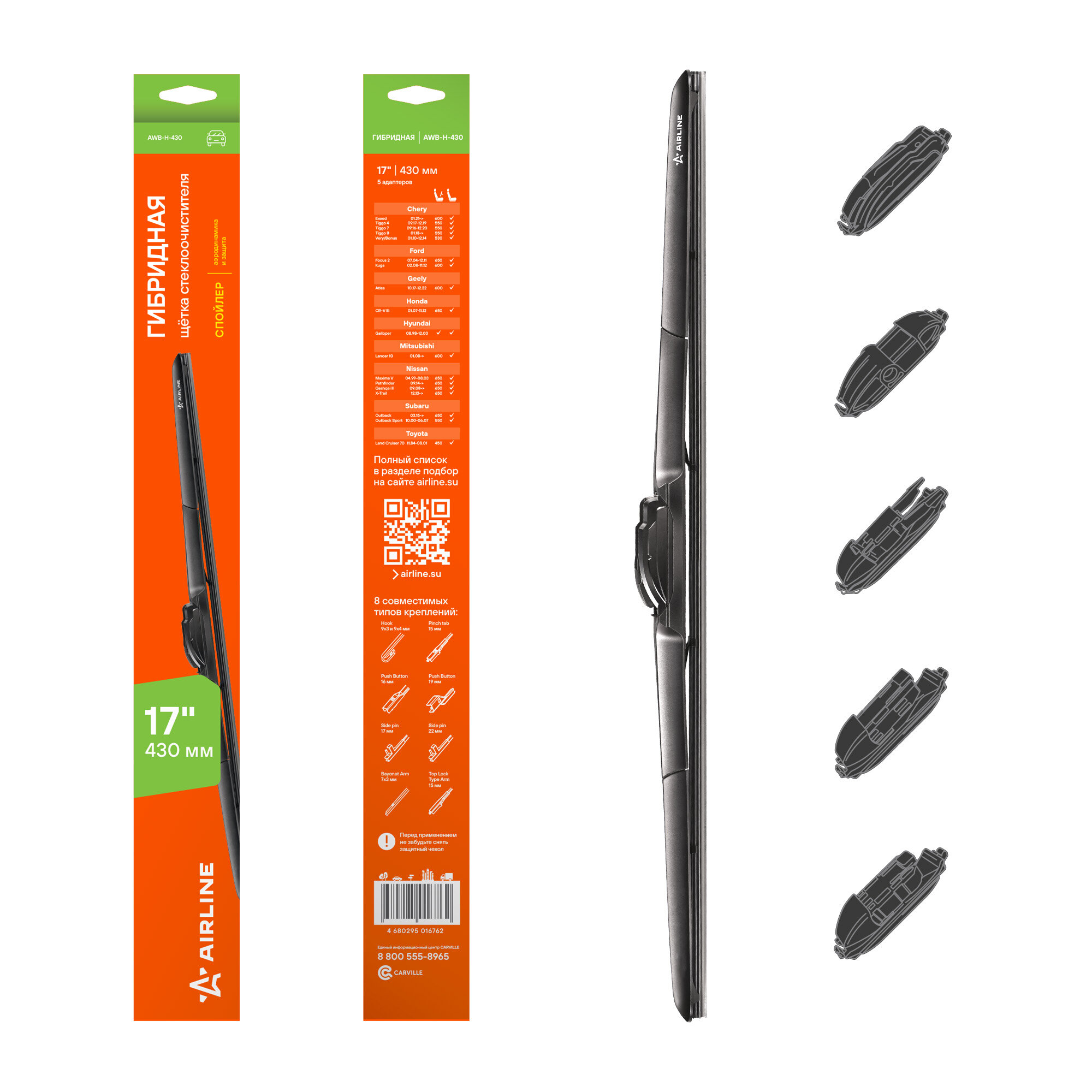 AIRLINE AWBH430 щетка стеклоочистителя гибрид 430ММ (17) 3 адаптера (AWB-H-430)
