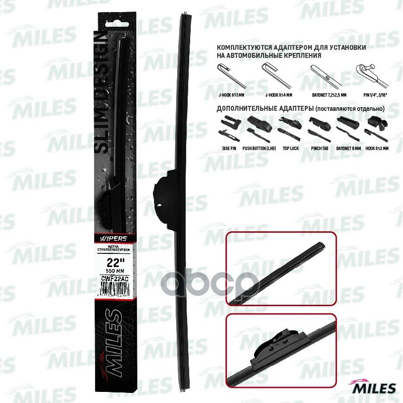 Щётка стеклоочистителя Miles CWF22AC бескаркас std 22"/550mm + color box + b3 adaptor hook 9x3/9x4 Miles CWF22AC