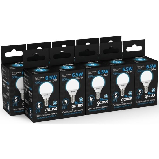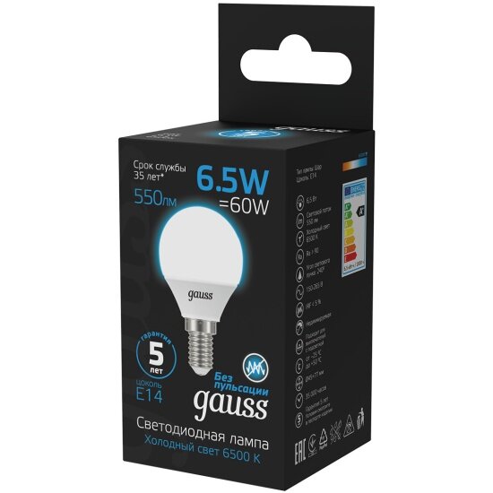 Светодиодная лампа Gauss Шар 6.5W 550lm 6500K E14 LED 1/10/100 информация: