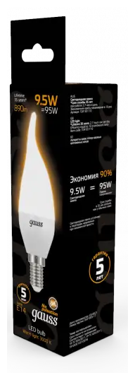 Лампа светодиодная Gauss 9.5Вт цок.:E14 свеча 220B 3000K св.свеч.бел.теп. (упак.:1шт) (104101110)