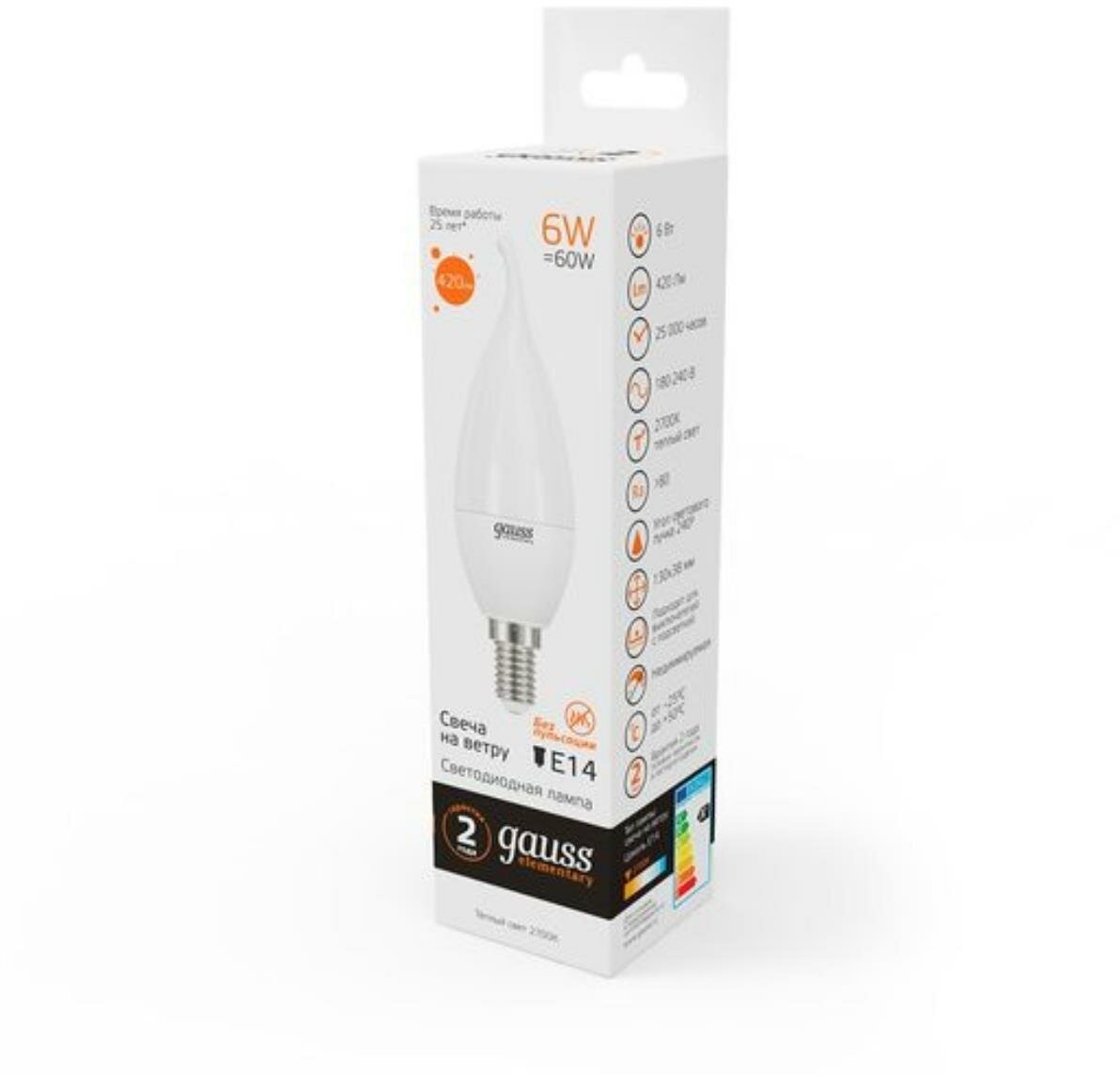 Лампа светодиодная Elementary 6Вт свеча на ветру 3000К тепл. бел. E14 420лм GAUSS 34116 информация: