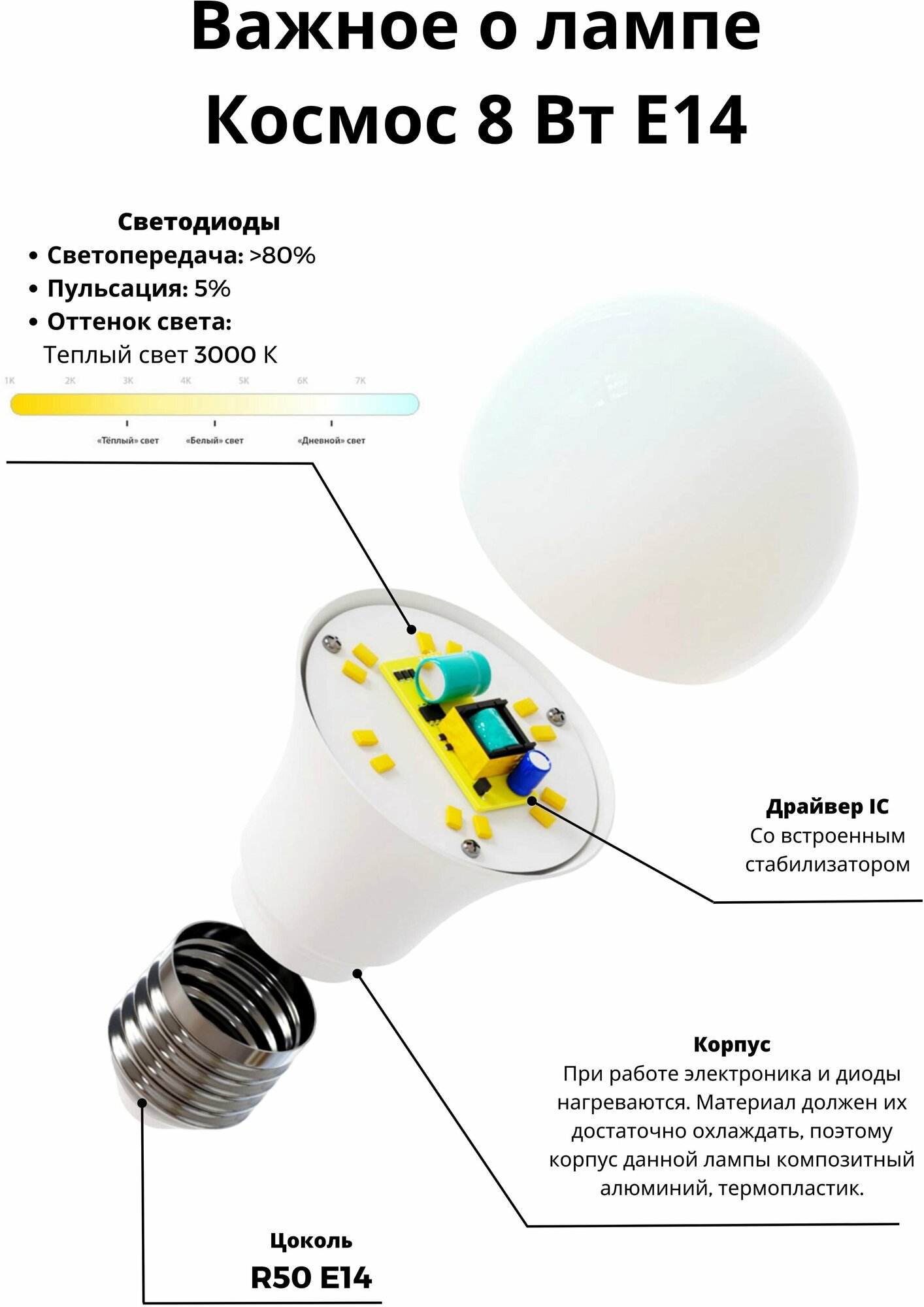 Лампа светодиодная R50 8Вт 220В E14 3000К Космос Lksm_LED8wR50E1430 информация: