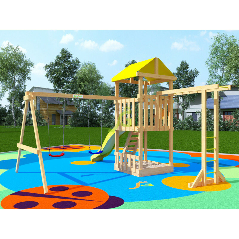 | Комплектация | подвесные качели с пластиковыми сидениями, песочница, лесенка, горка, канат,столик,рукоход |