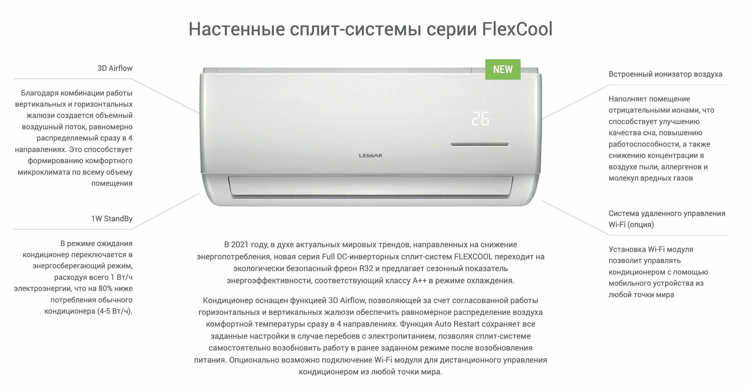 Настенный кондиционер Lessar FlexCool R32 LS-HE18KSE2/LU-HE18KSE2 информация: