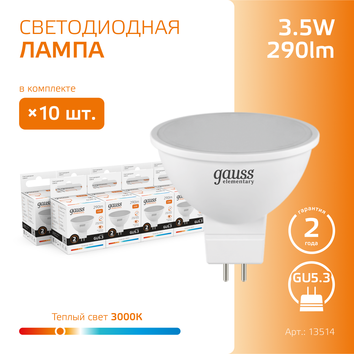 10 цен на Упаковка ламп LED GAUSS GU5.3, спот, 3.5Вт, 3000К, белый теплый, MR16, 10 шт. [13514]