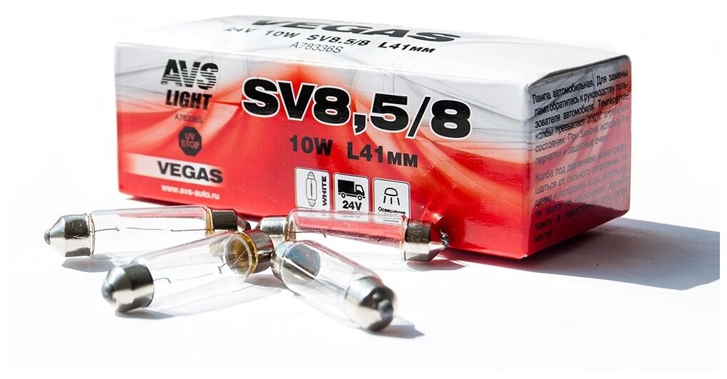 Лампа AVS Vegas 24V.C10W(SV8.5/8)L41мм. BOX 10шт. информация:
