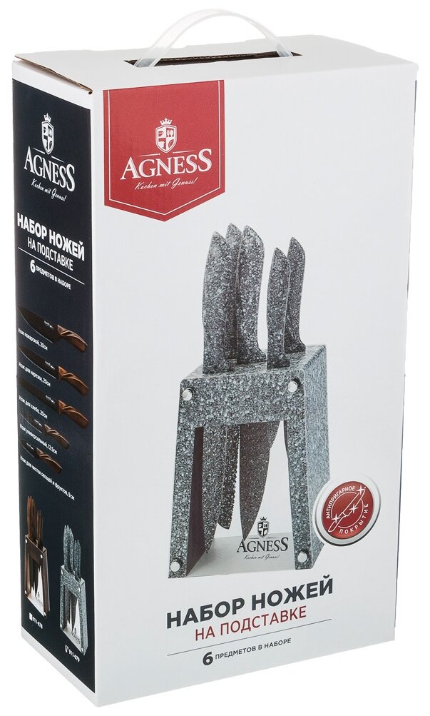 | Комплектация | нож поварской 20 см, нож для хлеба 20 см, нож для нарезки 20 см, нож универсальный 12,5 см, нож для чистки овощей и фруктов 9 см, подставка для безопасного хранения |