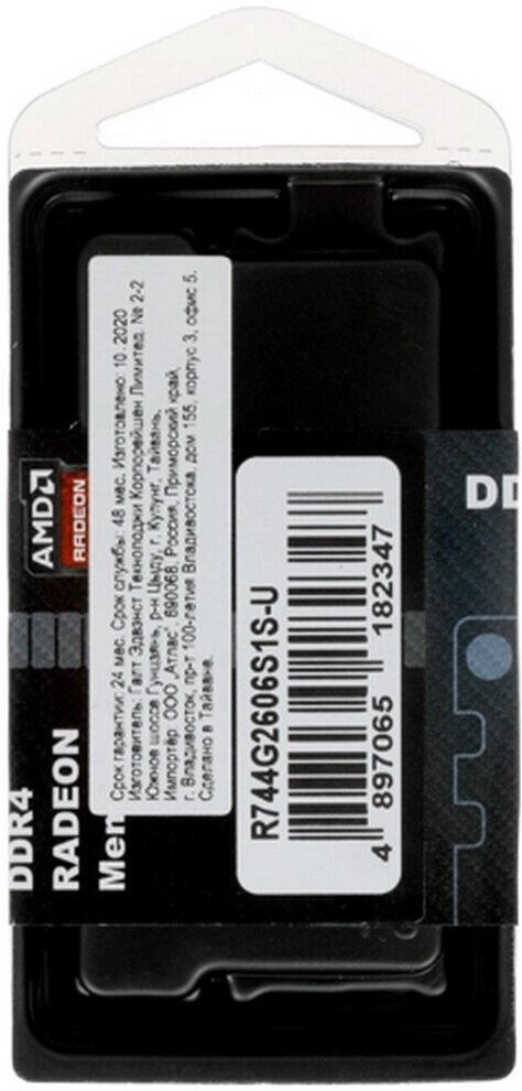 Модуль памяти 4GB AMD Radeon DDR4 2666 SO Dimm R7 Performance Series Black R744g2606s1s-u Non-ECC, . 1 517 ₽