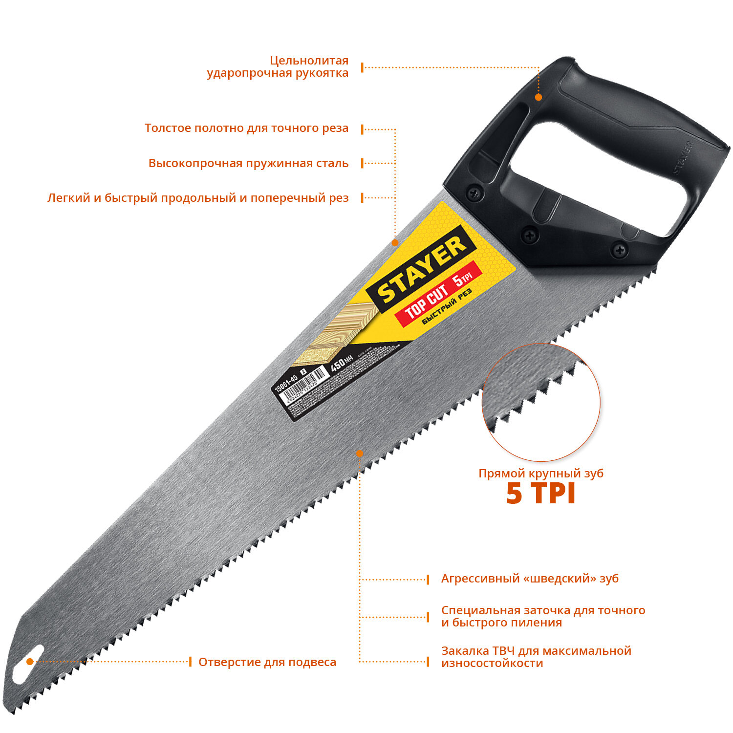 Ножовка ударопрочная (пила) STAYER "TopCut" 450 мм, 5 TPI, быстрый рез поперек волокон 15061-45_z02