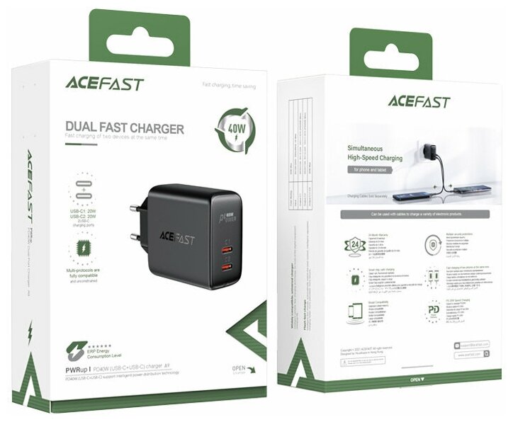 Зарядное устройство двухпортовое ACEFAST A9 PD40W USB-C+USB-C dual port charger EU. Цвет: черный