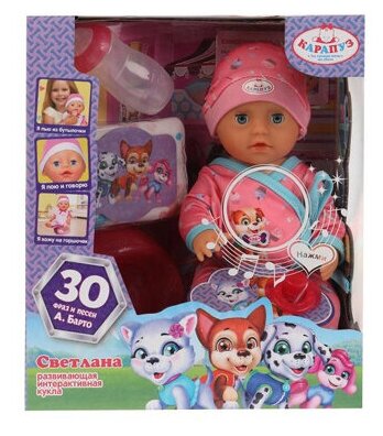 Пупс озвуч. Светлана 25см (Барто А.. в боди, пьет, пис, закр гл, 30 произв, 4 акс.) в коробке информация: