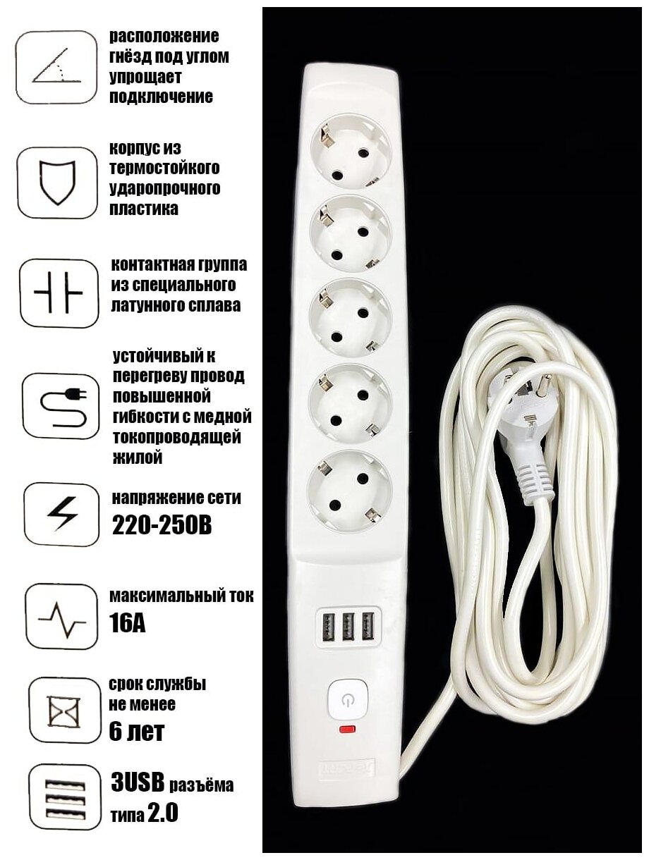 Сетевой фильтр-удлинитель 5 розеток, 3 метра, 3 USB, с заземлением, Белый информация:
