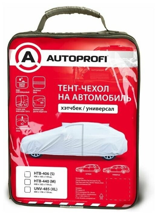 Тент-чехол на автомобиль AUTOPROFI, универсал, водонепроницаемый, двойные швы, два вентиляционных окна, молния для двери водителя, 2 ремня для фиксации тента, 485х178х119 см. разм. XL