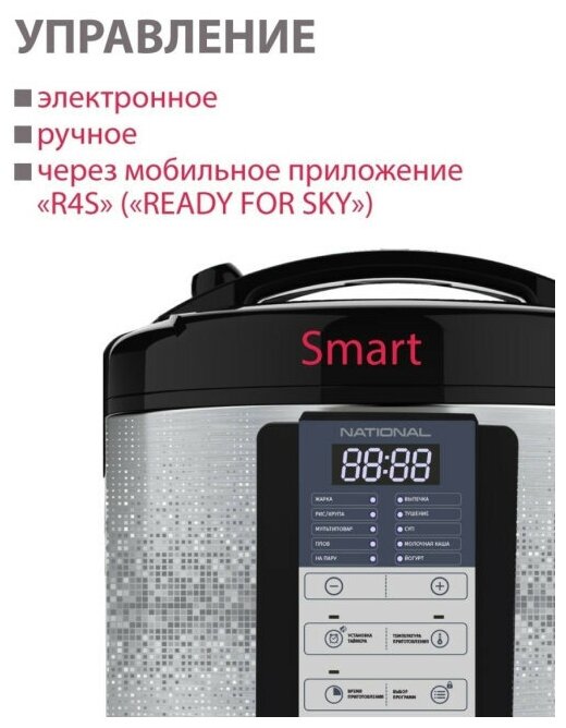 | Дополнительная информация | тип управления: электронное ручное или через мобильное приложение «R4S» («READY FOR SKY»); поддержание тепла: до 12 часов; отложенный старт: до 24 часов; термоизолированный корпус; функция «СМАРТШЕФ плюс»; функция экспресс; 11 автопрограмм; 145 программ ручной настройки; 138 рецептов в мобильном приложении «R4S» |