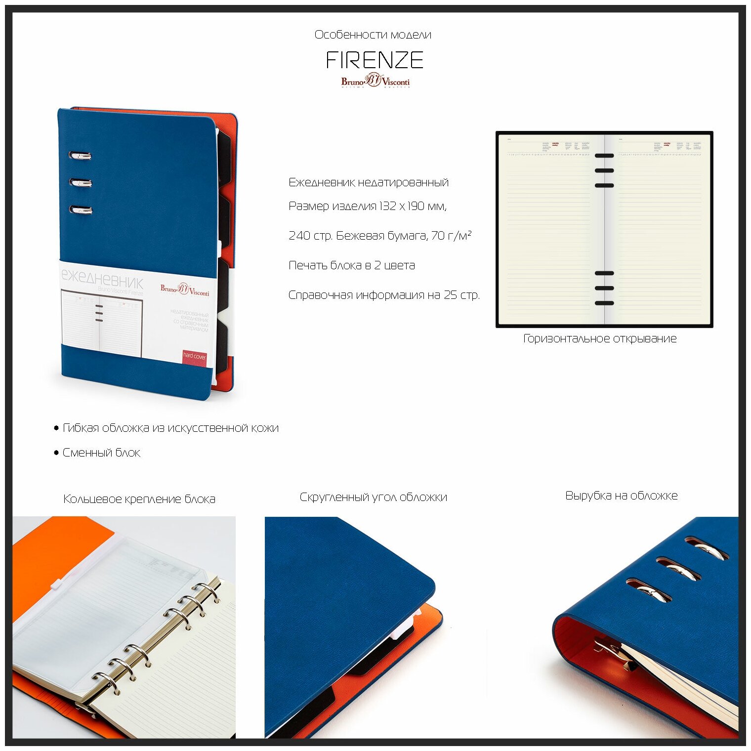 Ежедневник BrunoVisconti недатированный, А5 (132 х 190 мм), "FIRENZE" темно-синий navy 240 стр., Арт. 3-511/06