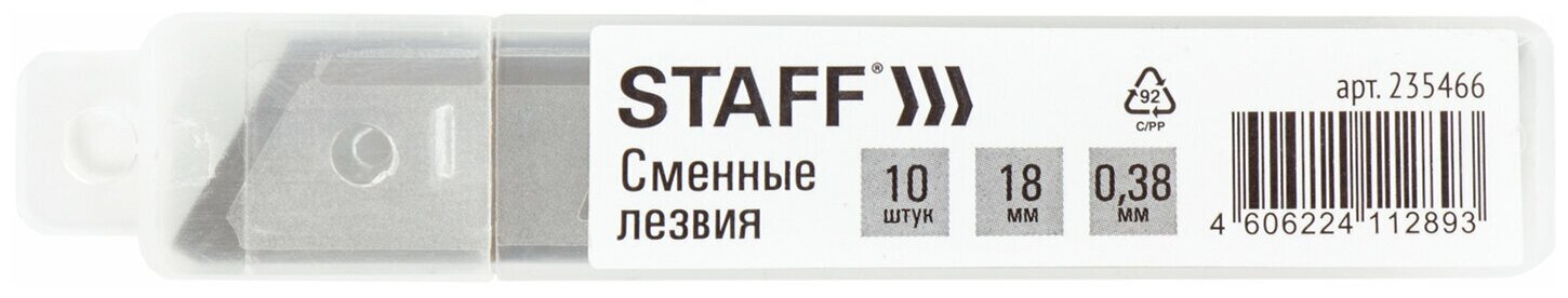 Лезвия для ножей 18 мм комплект 10 ШТ., толщина лезвия 0.38 мм, в пластиковом пенале, STAFF "Basic", 235466