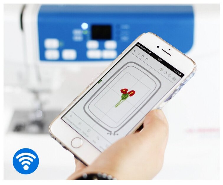 | Дополнительная информация | беспроводное подключение Wi-Fi, приложение для мобильного устройства MyPatterns (на русском языке с широким набором функций), датчик положения пялец, поддерживаемые вышивальные форматы.pes, .dst, .phc, .exp, .pec, .jef, .sew, .xxx, .hus, .vp3; редактирование вышивок в меню машины, контроль скорости вышивания, счетчик стежков и времени вышивки |