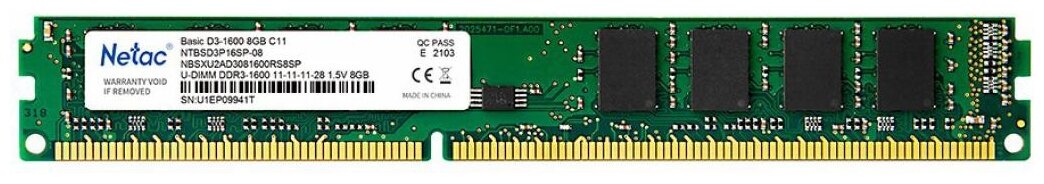 Память DDR3 8Gb 1600MHz Netac NTBSD3P16SP-08 Basic RTL PC3-12800 CL11 DIMM 240-pin 1.5В