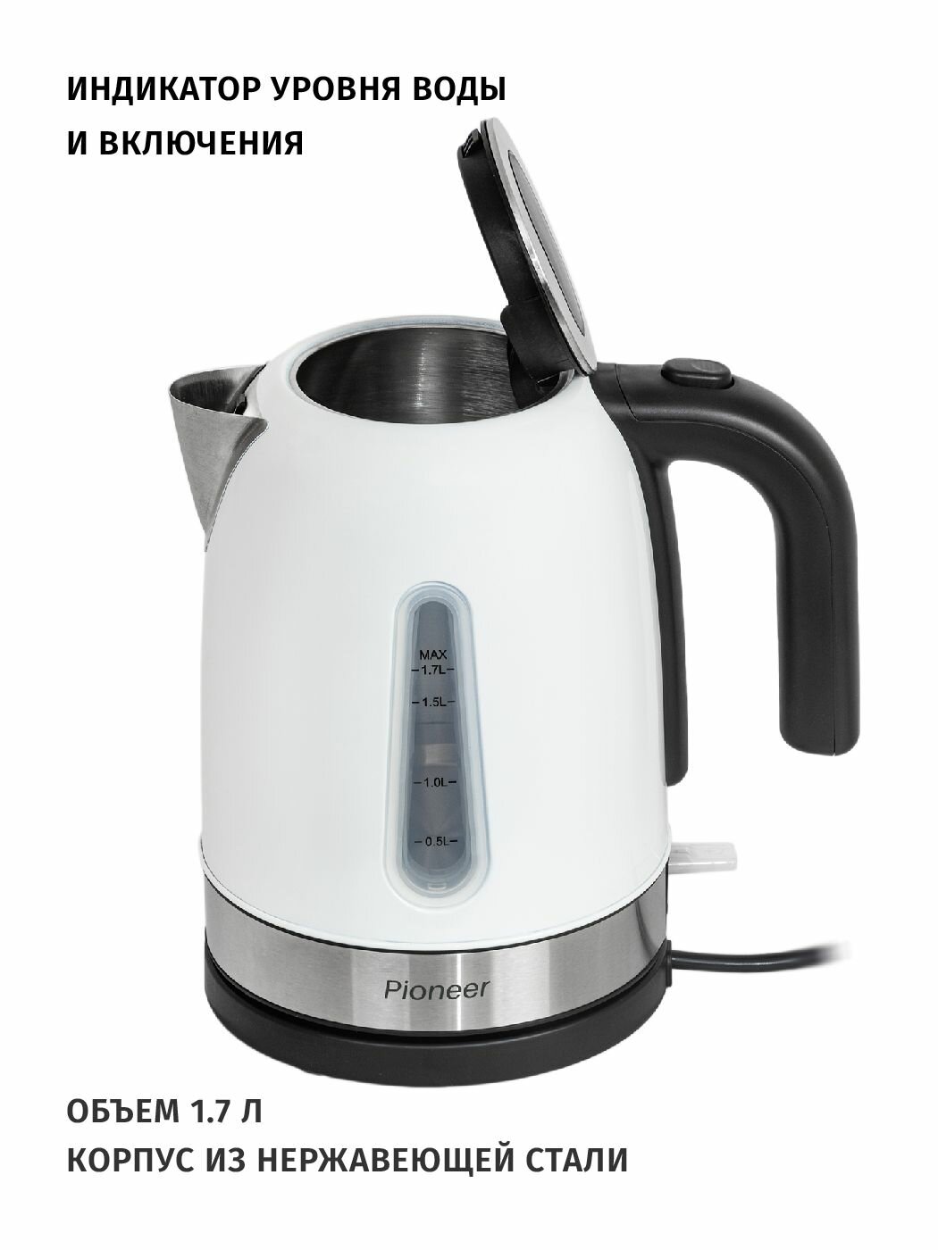 Чайник электрический Pioneer KE556M White 1,7 л, корпус из нержавеющей стали, контроллер STRIX, фильтр от накипи, 2200 Вт