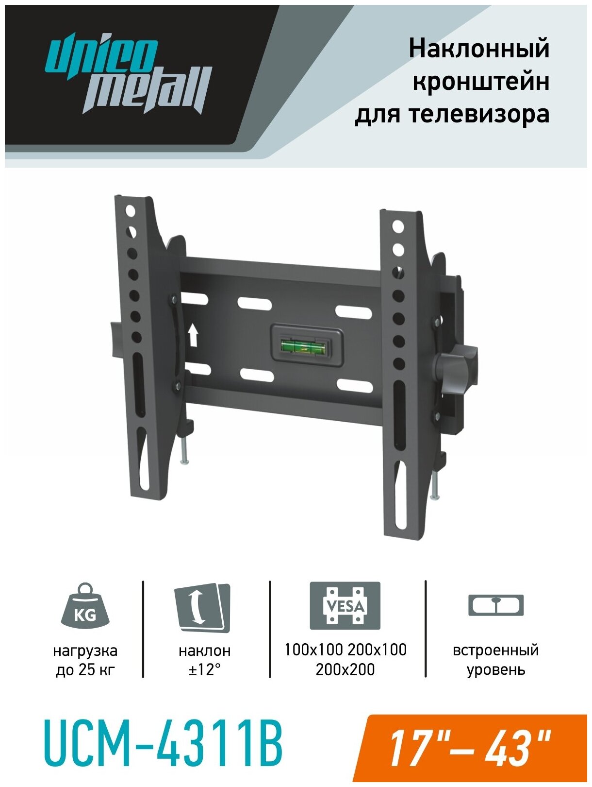 UCM-4311B. Наклонный кронштейн для телевизора с диагональю от 17 до 43 дюймов (42,5-107 см), VESA 75х75/100х100/200х100/200х200 мм. информация: