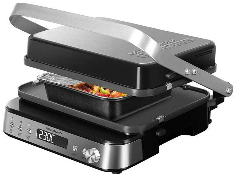 Купил этот прибор, потому что давно хотел. Он быстро готовит, без жирных потеков. Это мощный гриль, духовка и барбекю в одном. Корпус из нержавейки, большой дисплей, стильный хай-тек дизайн. Готовит вкусно, быстро и красиво. Три режима: гриль, духовка и барбекю. Ребристые и плоские панели, антипригарное покрытие. Электронное управление, регулировка температуры от 80 до 230 градусов. Таймер на 60 минут. Жир стекает в поддон, панели съёмные. Всё продумано, ничего лишнего.