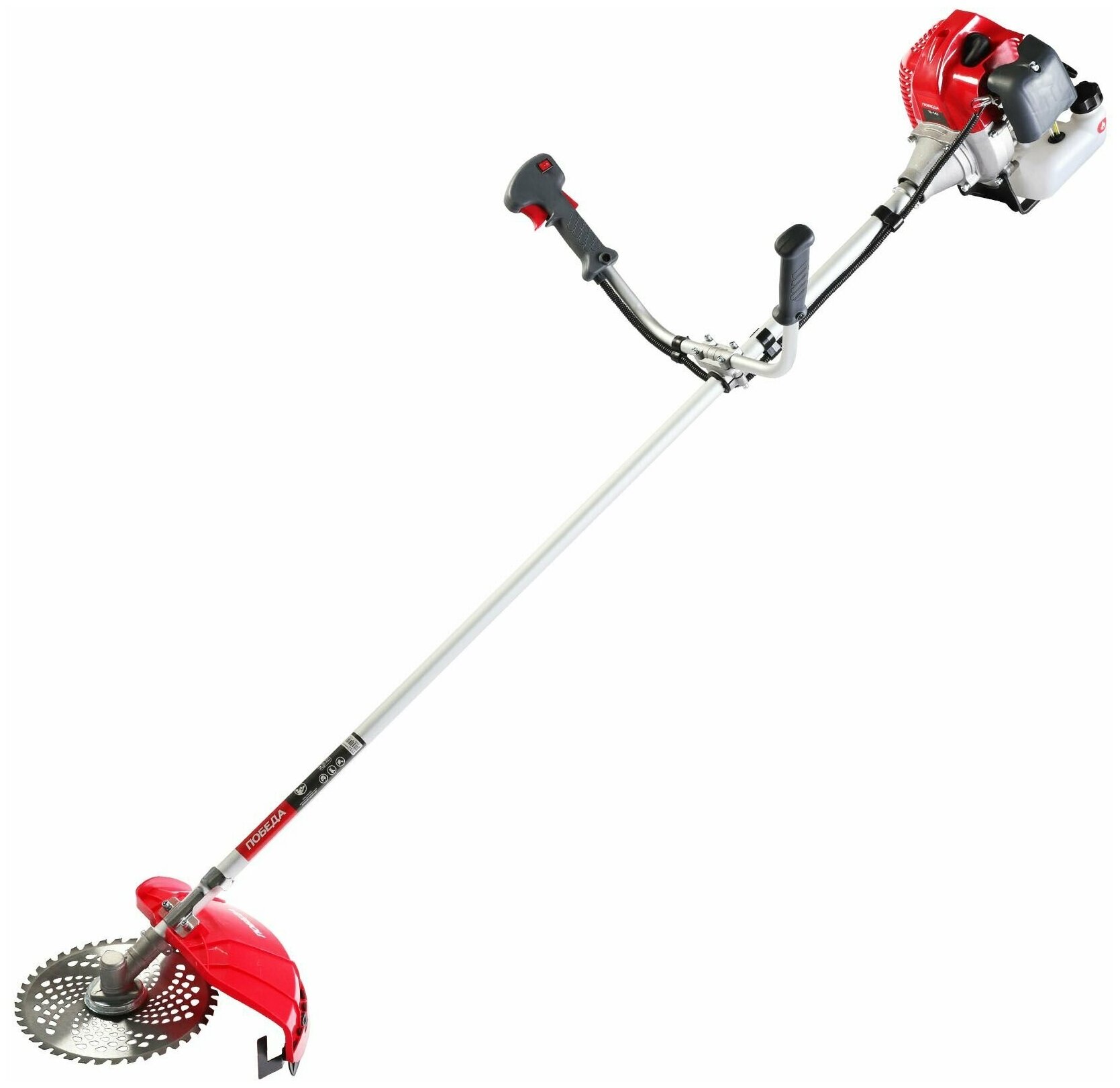 Отзывы на Триммер бензиновый Победа ТБ 143, раб. объем 43 сс, 2,5 л.с., велосипедная рукоятка, катушка с леской, 40 зуб., нож 255 мм / бензотриммер