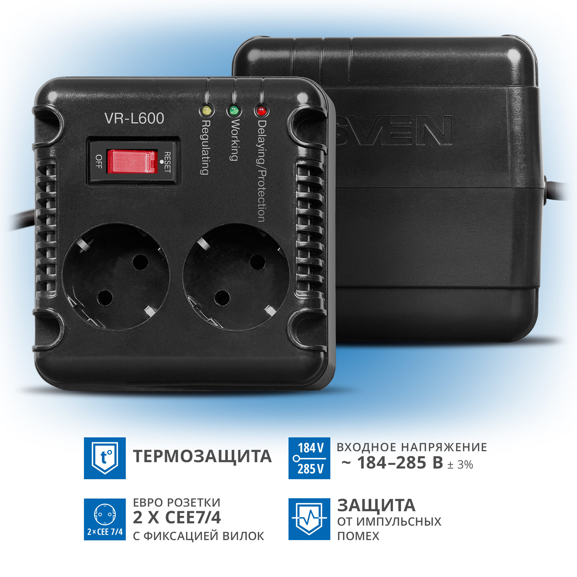 Автоматический стабилизатор напряжения SVEN VR-L600(200Вт,Входное 184 – 285В, 2*CEE7/4 розетки, Выходное 230В, черный пластик. корпус)