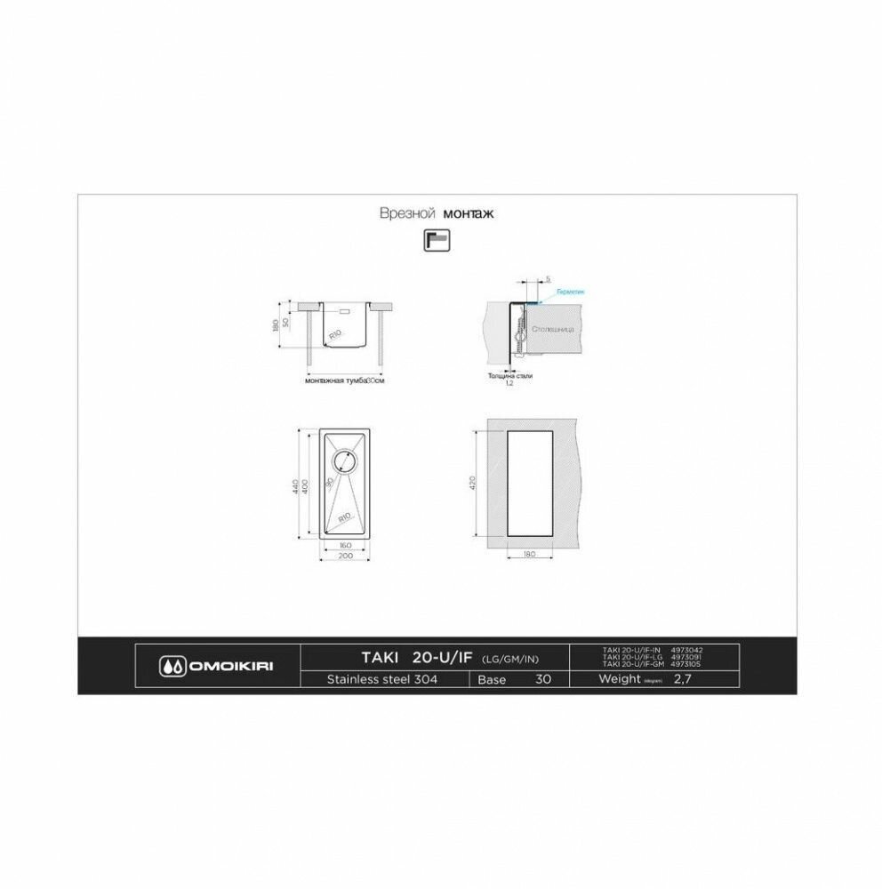 Мойка кухонная прямоугольная Omoikiri Taki 20-U/IF-GM вороненая сталь (4973105) 25 888 ₽
