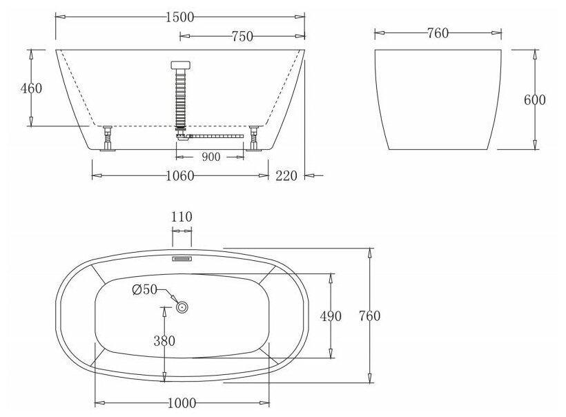 Ванна Ceruttispa COMO150 акриловая (1500x750x560) отдельностоящая, белая