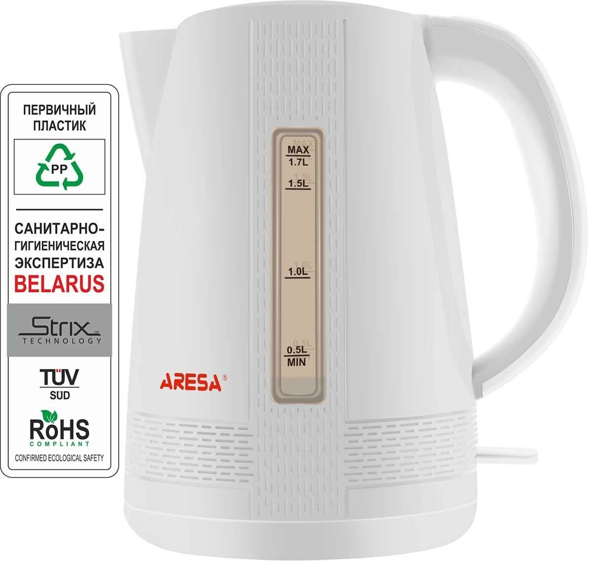 10 цен на Чайник Aresa AR-3438 (Объём 1,7л,мощность 2150Вт,пластиковый корпус,световая индикация)белый