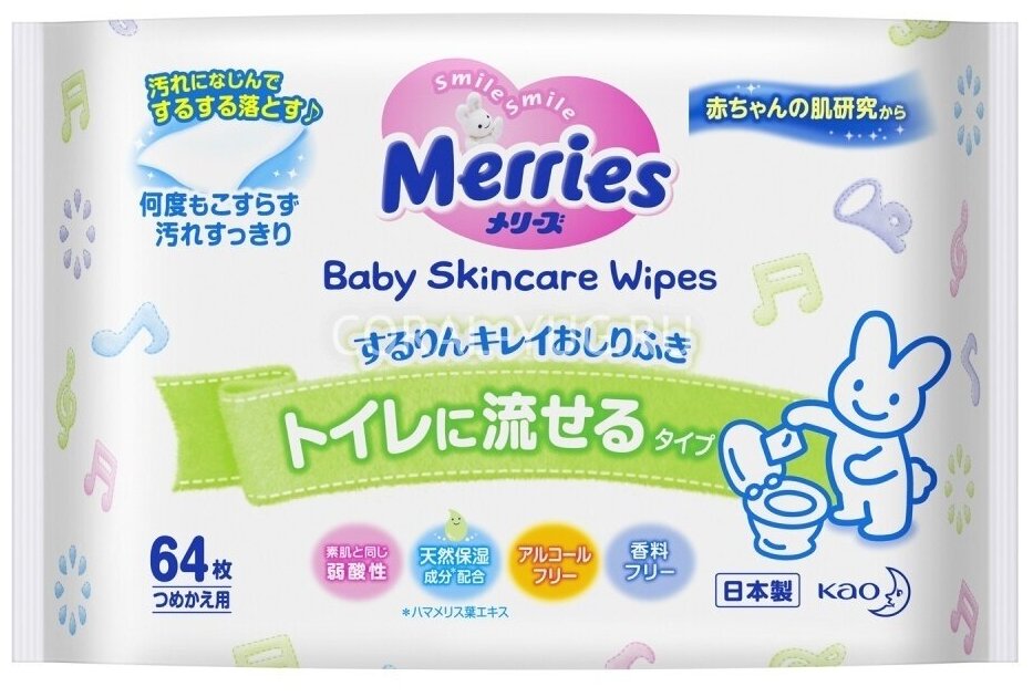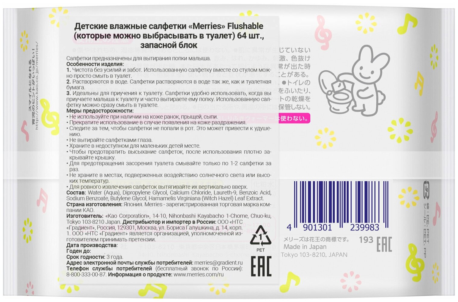 MERRIES Детские влажные салфетки Flushable , Запасной блок. 64 шт.