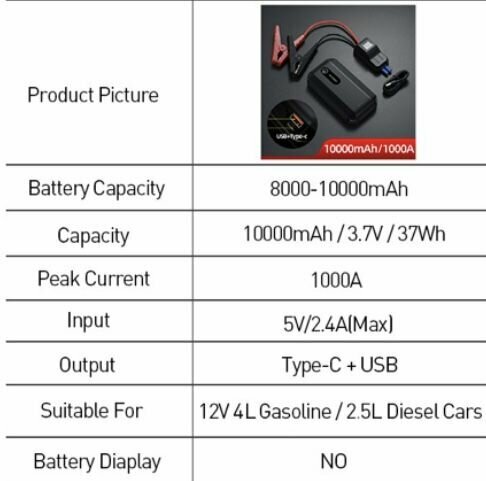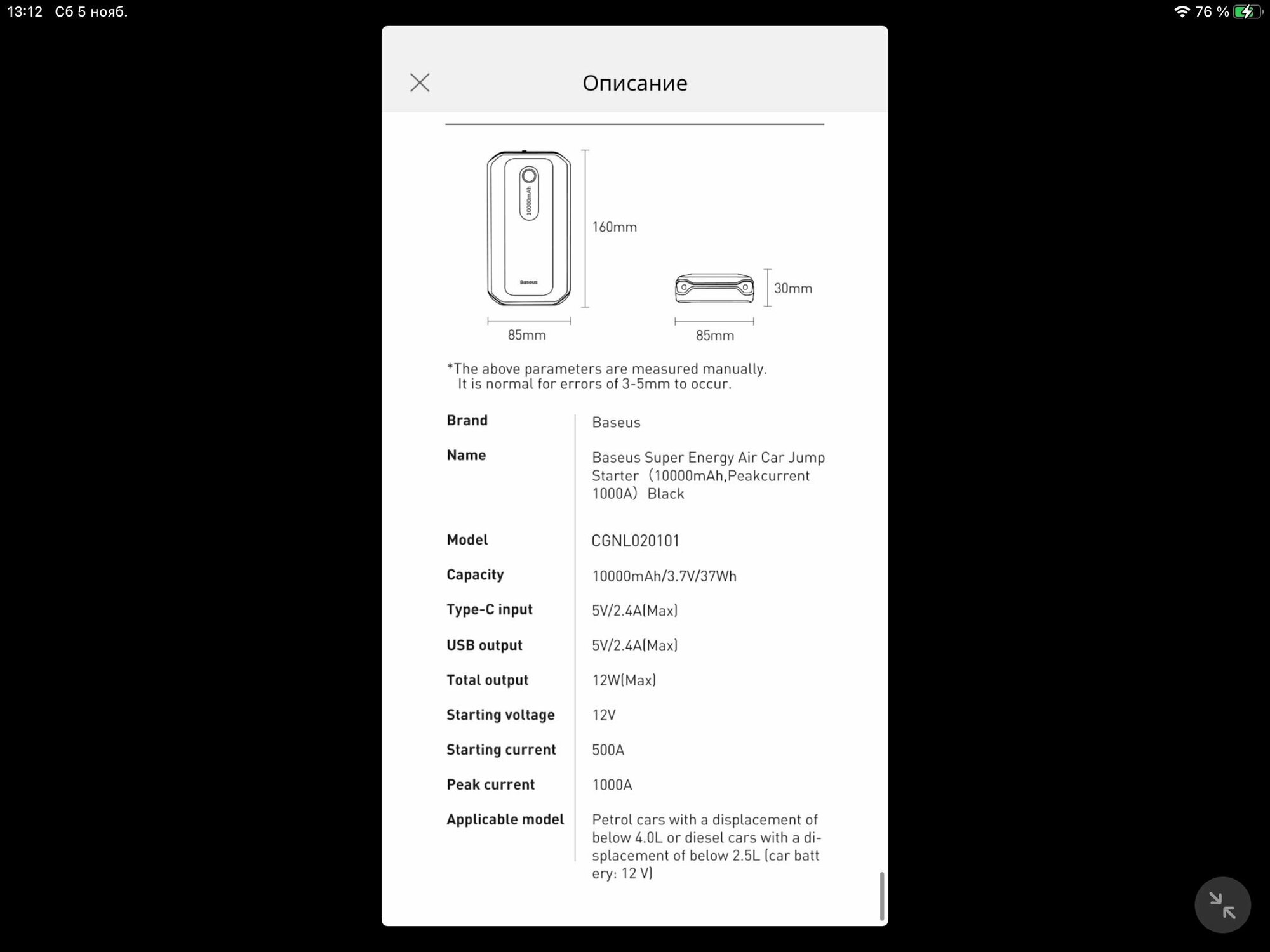 Автомобильное пусковое устройство, бустер BASEUS 10000 мАч 1000A информация: