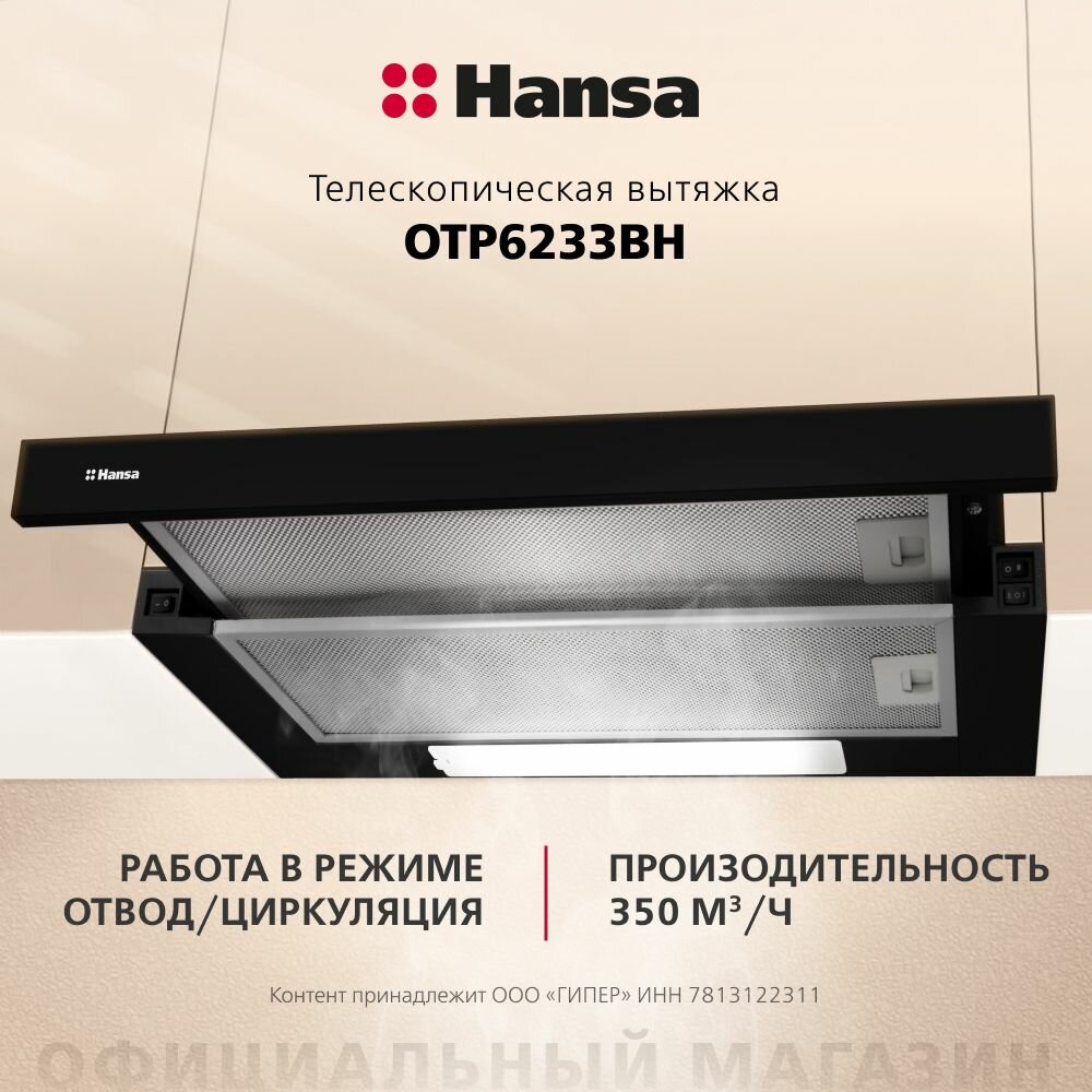 Телескопическая вытяжка Hansa OTP6233BH, 60 см, механическое управление, 3 скорости, режимы отвода и рециркуляции, светодиодная подсветка, черная 7 641 ₽