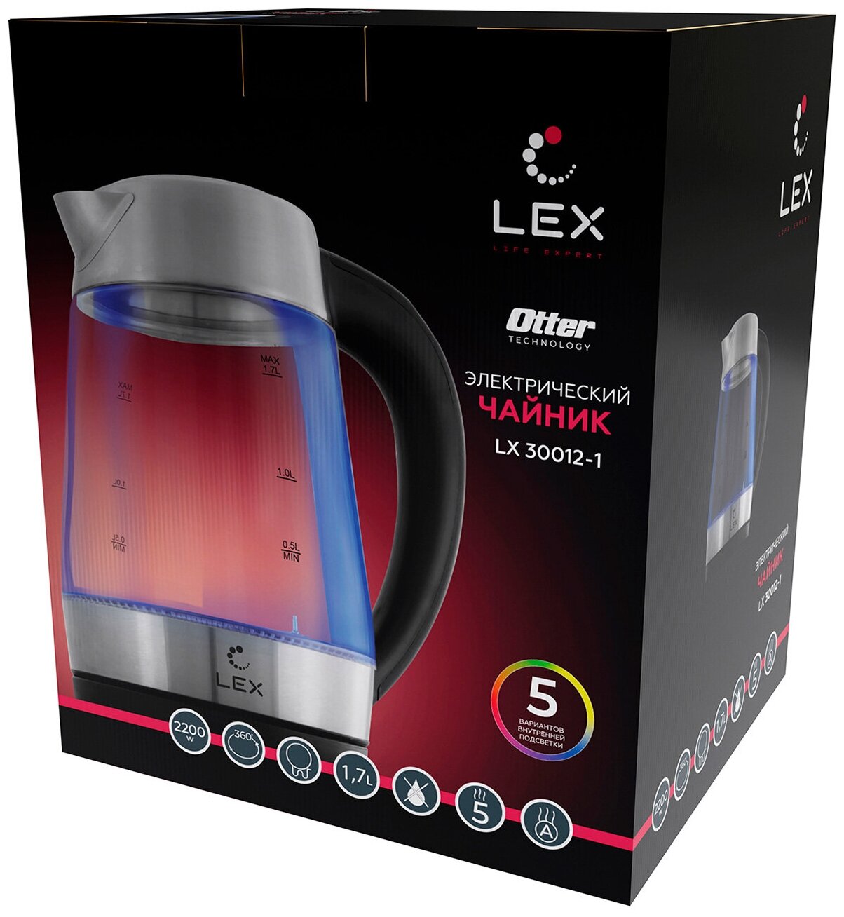 Чайник электрический стеклянный LEX LXK 30010-1, объем 1,2 л, подсветка.