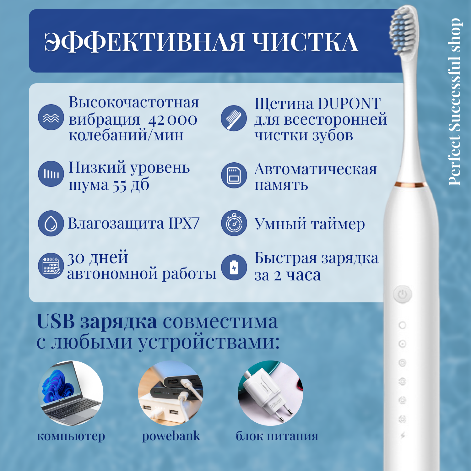 Электрическая зубная щетка Smart Sonic, длительный срок службы, 6 насадок, белый.