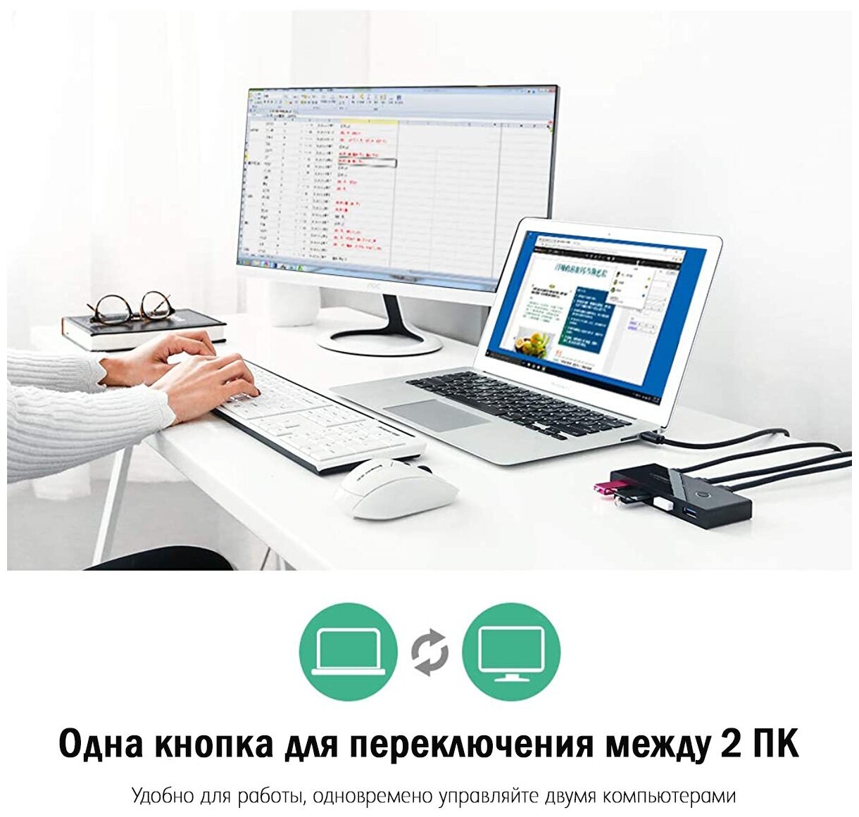 Многофункциональный разветвитель UGREEN на 4 порта USB для одновременного подключения устройств к двум компьютерам