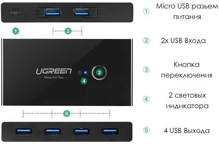 Отзывы на Разветвитель портов UGREEN 2 In 4 Out USB 3.0 Sharing Switch Box US216 (30768)