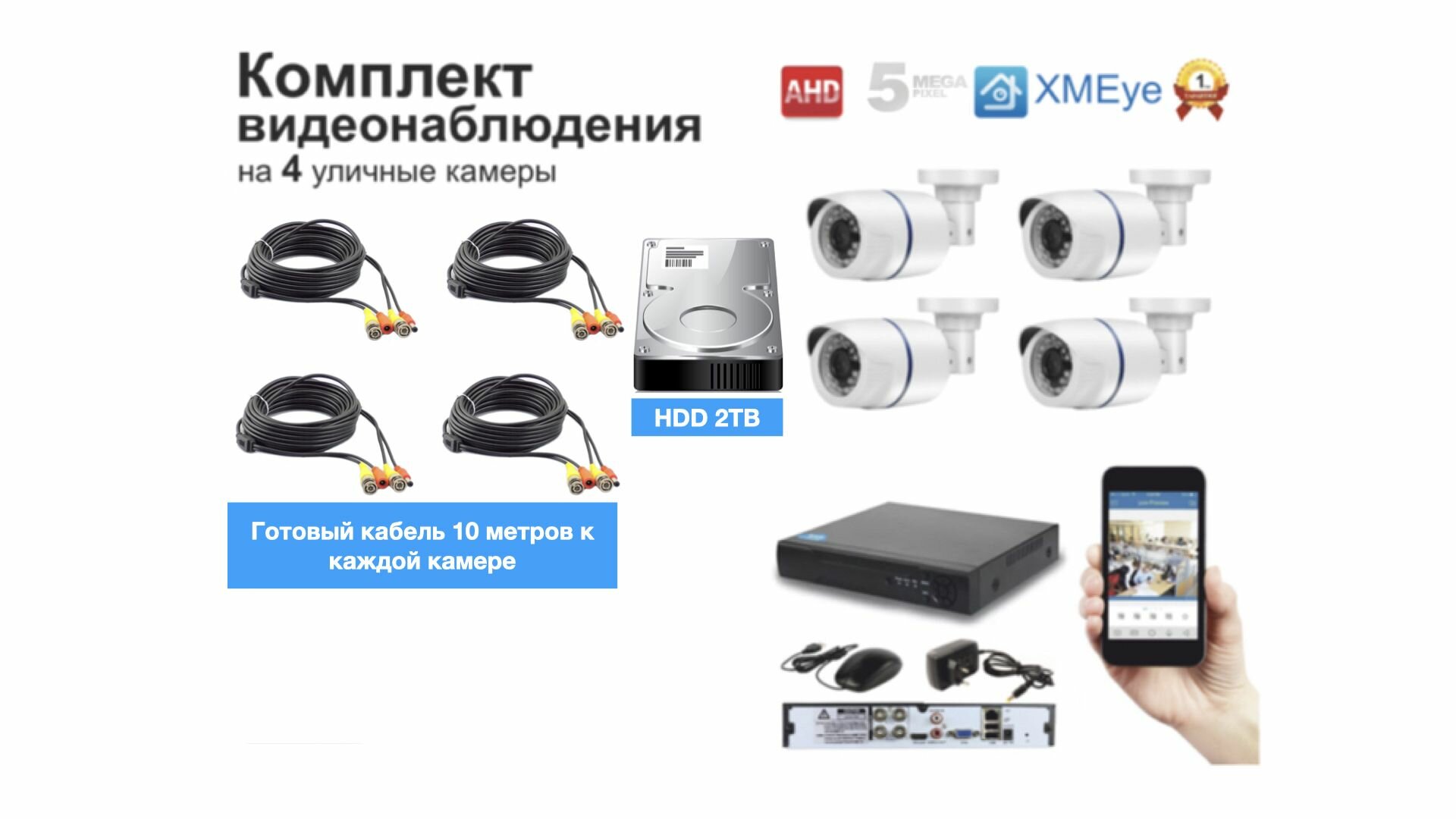 10 цен на Полный комплект AHD видеонаблюдения на 4 камеры 5мП (KIT4AHD100W5MP_HDD2TB)