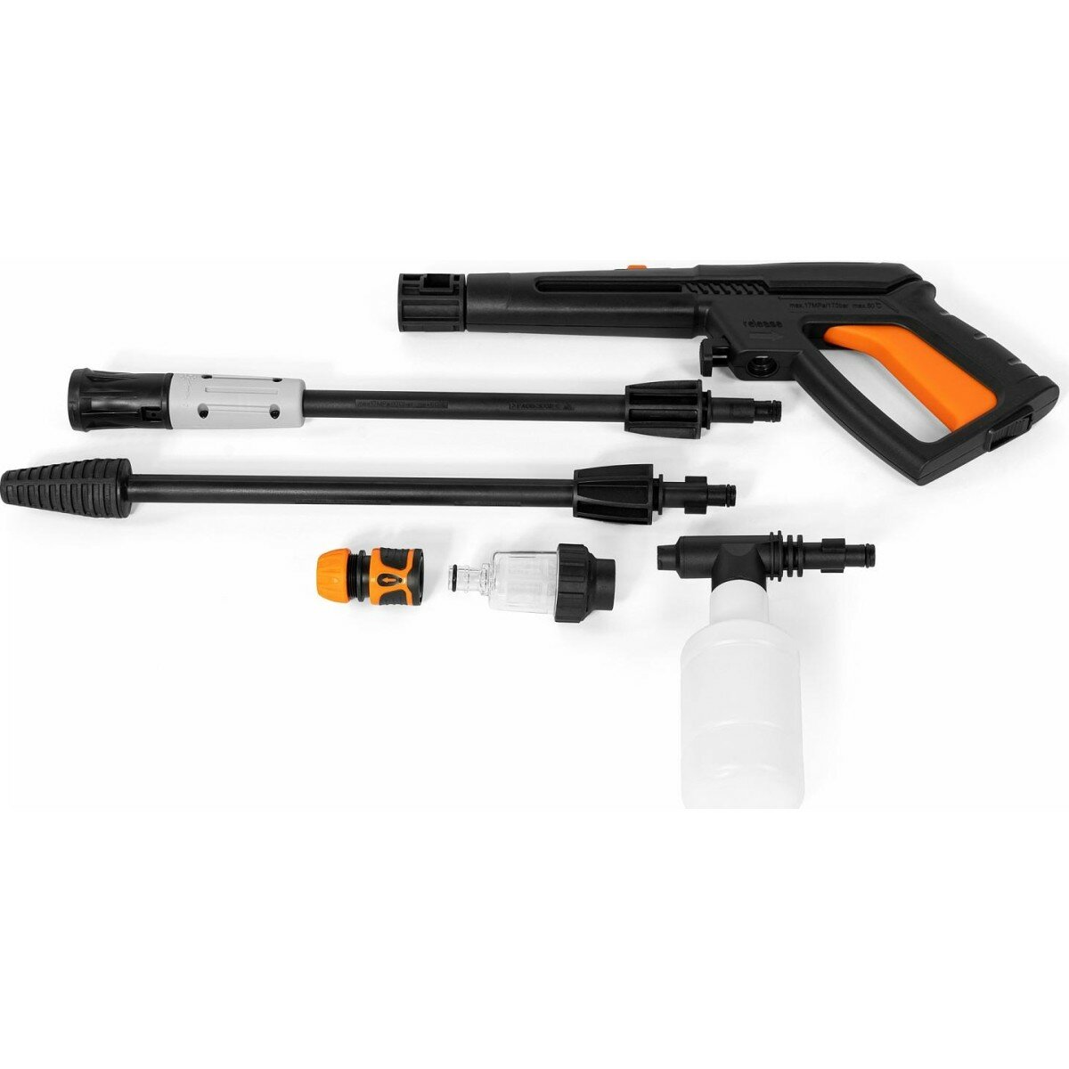 | Подробная комплектация | пистолет; шланг высокого давления, насадка на пистолет распылительная, насадка на пистолет грязевая фреза, дополнительный фильтр тонкой очистки, быстросъемный коннектор, пеногенератор, игла для прочистки сопла |