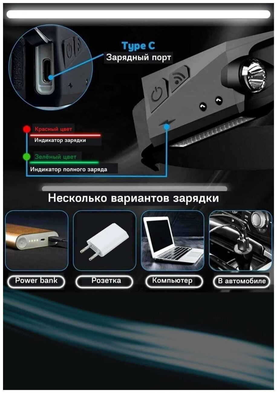 Светодиодный фонарь налобный сенсорный, 5 режимов работы, строительный, мощный фонарь информация: