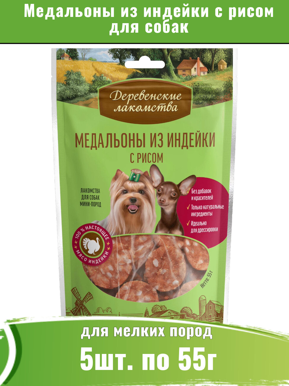 Деревенские лакомства 5шт х 55г медальоны из индейки с рисом для собак мини-пород