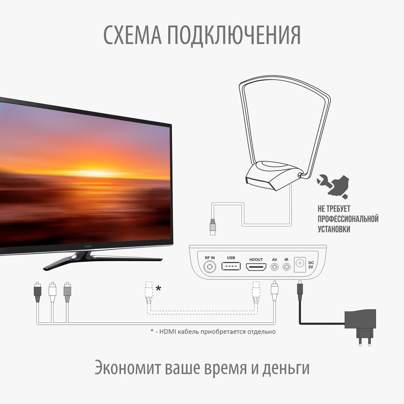 Комплект (ТВ приставка + комнатная антенна) бесплатного цифрового телевидения РЭМО DVB-T2 информация: